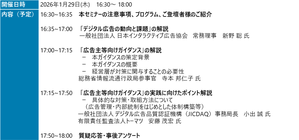 本セミナーでは、デジタル広告の動向と課題を丁寧に解説した上で、経営層の皆様が対策に関与することの必要性や広告主企業等に求められる具体的な取組についてご紹介し、適切な広告活動を行う上でのヒントを提供します。