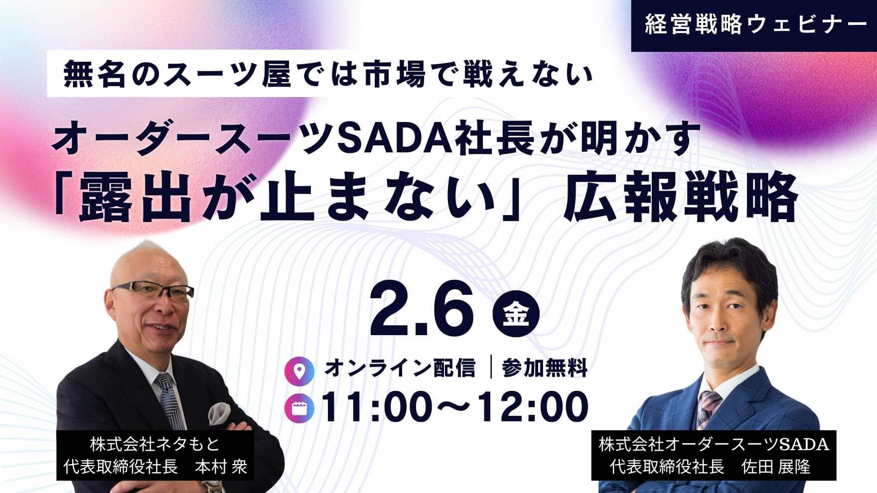 本ウェビナーでは、株式会社オーダースーツSADA 代表取締役社長 佐田 展隆 氏をゲストにお招きし、「自らネタ作り」に徹底的にコミットするという独自の広報戦略に迫ります。広報のプロではなく、経営者自身がどのようにメディアと向き合い、オファーを獲得し続けてきたのか。その秘密を今回、特別に公開します!