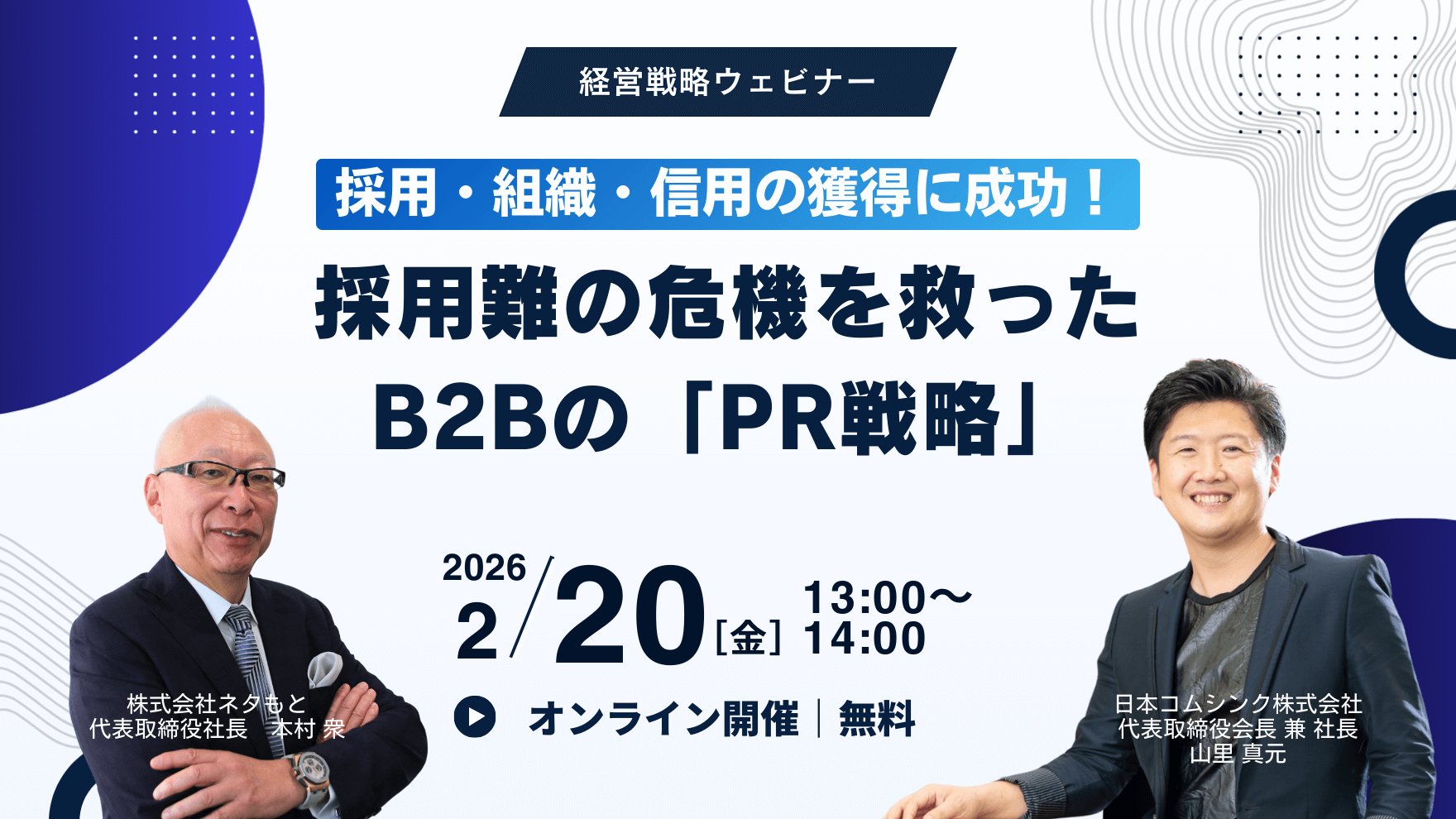 本ウェビナーでは、特別ゲストとして日本コムシンク株式会社 代表取締役会長 兼 社長 山里真元 氏をお迎えし、経営者自ら「経営戦略」として「PR」に取り組み、人材採用と企業成長の両面で成功した秘訣を、弊社代表 本村衆との対談形式でお届けします。
