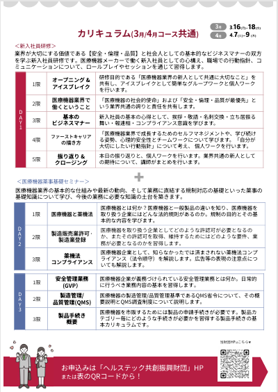 新入社員研修と薬事の基礎がセットで学べる医療機器業界新入社員セミナー 3日間コース