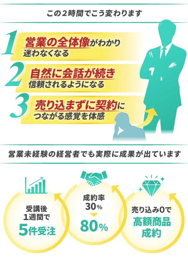 営業未経験でも契約が取れる!受講後1週間で5件受注!経営者専門。売り込まず成約率80%を実現する2時間コンサル