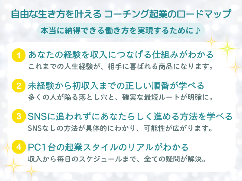 「今の働き方や人生に物足りなさを感じている人」に向けた、SNSなしで始めるコーチング起業・副業の入門講座です。毎日投稿やインスタ映えに消耗することなく、コーチとしての本来の仕事に集中しながら初収入を得るまでの現実的な6ステップを、90分で丸ごと学べます。